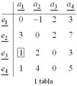 Felírjuk egy közös táblázatba a négy megadott vektort. Jelenleg mindegyik vektor az e1, e2, e3, e4 vektorok által kifeszített négydimenziós bázistérben fekszik. Választunk egy generáló elemet az első oszlopban: